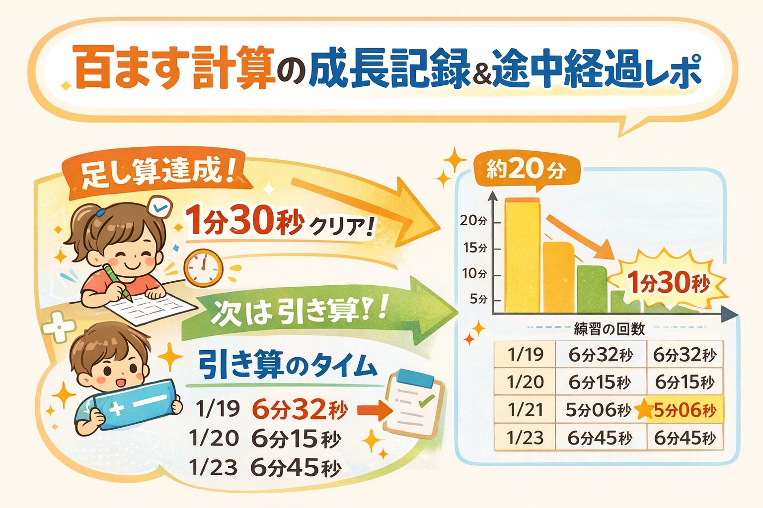 目標にしていたタイムを達成できたので、次のステップとして百ます計算の「引き算」に挑戦することにしました。